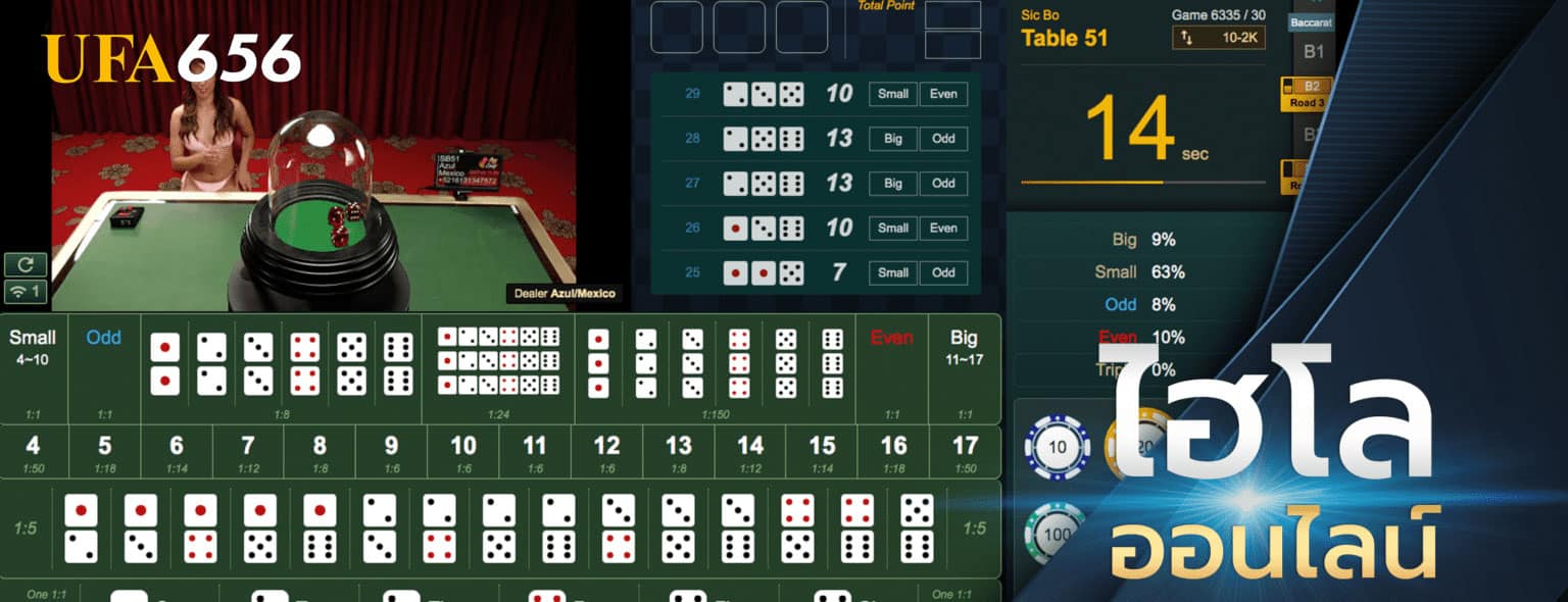 ไฮโล คือ เกมลูกเต๋าอันดับ 1 ในคาสิโนออนไลน์ ถูกดัดแปลงมาจาก ไฮโลดั้งเดิม ไฮโลออนไลน์ ที่เล่นกันตามบ้านหรือบ่อนคาสิโนเกมจะใช้ลูกเต๋าหกหน้า 3 ลูก แต่ละหน้าของลูกเต๋าจะมีจุด 1 ถึง 6 วิธีการเล่นไฮโลก่อนเริ่มเกมจะมีเวลา 40 วินาที ให้ผู้เล่นเลือกเดิมพัน เว็บ ufa656 ทางเข้า เมื่อหมดช่วงเวลาการลงเดิมพัน ดีลเลอร์(เจ้าหน้าที่)จะทำการเขย่าโหลครอบที่มีลูกเต๋า 3 ลูกอยู่ข้างใน เมื่อเปิดโหลครอบออกลูกเต๋าทั้ง 3 ลูกออกมาเป็นจุดอะไรบ้าง ผู้เล่นที่แทง ไฮโล ได้ถูต้องก็จะได้เงินตามที่เกมกำหนดไว้ ซึ่งมีอัตราการจ่ายตั้งแต่ 1-150 เท่า ไฮโล ที่มีชื่อเรียกในคาสิโนออนไลน์ว่า ซิกโบ (Sicbo) จะมีตัวเลือกการเดิมพันที่แตกต่างจากการเล่น ไฮโลพื้นบ้านเล็ก น้อย ไฮโลไทย ได้เงินจริง แต่จะเหมือนกันเกือบทั้งหมด เช่น ไฮโลพื้นบ้าน จะมีการแทงแบบ ” 11 ไฮโล ” แต่ไฮโล(Sicbo)ไม่มี ไฮโลไทยฝาก-ถอนไม่มีขั้นต่ำ UFA656เว็บตรง